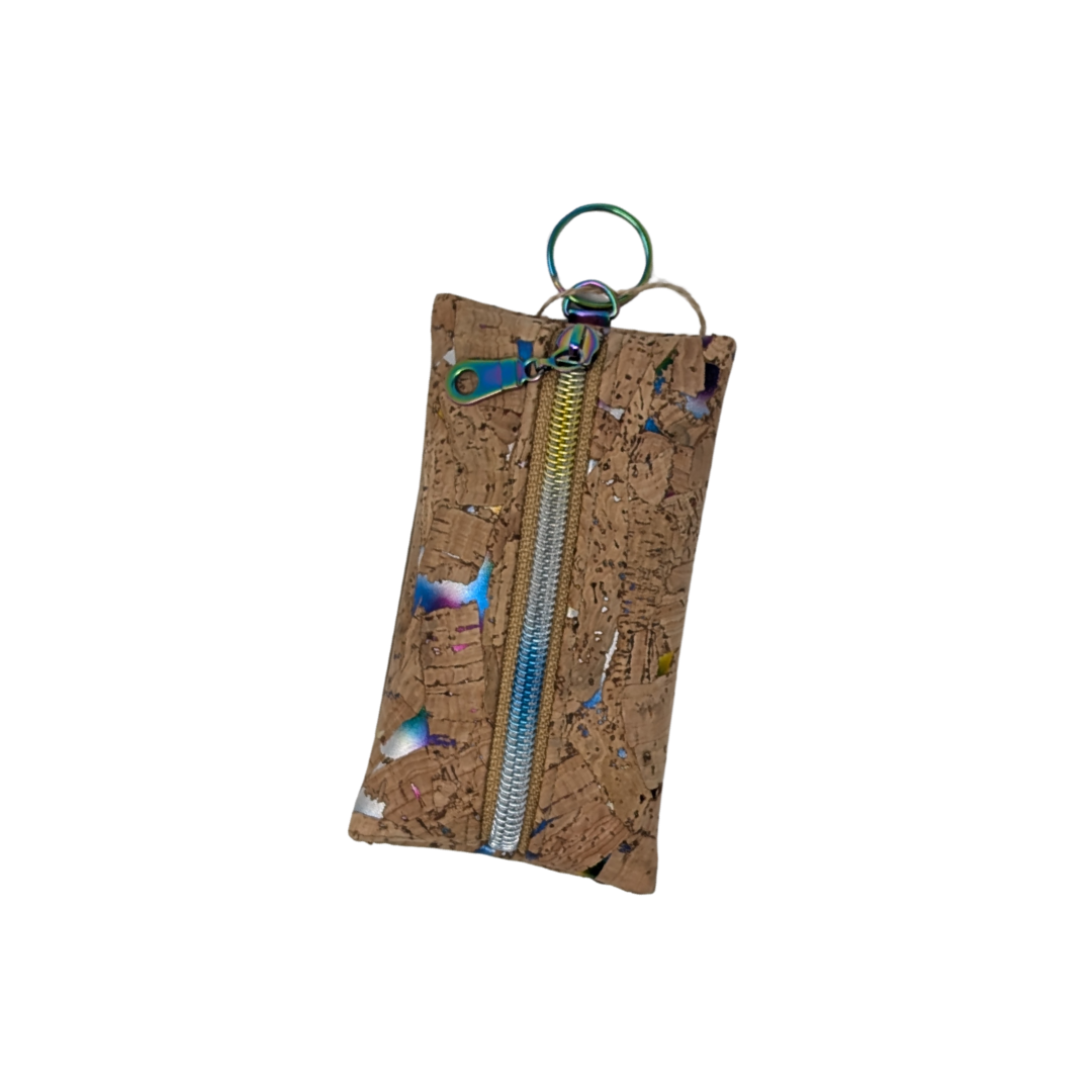 The pouch is large enough for credit cards, IDs, folded bills, and other small items like lip balm, nail clippers, etc. You can use the split key ring to hook it to your keys, backpack, etc. Made from either cork or faux leather, unlined on the interior.