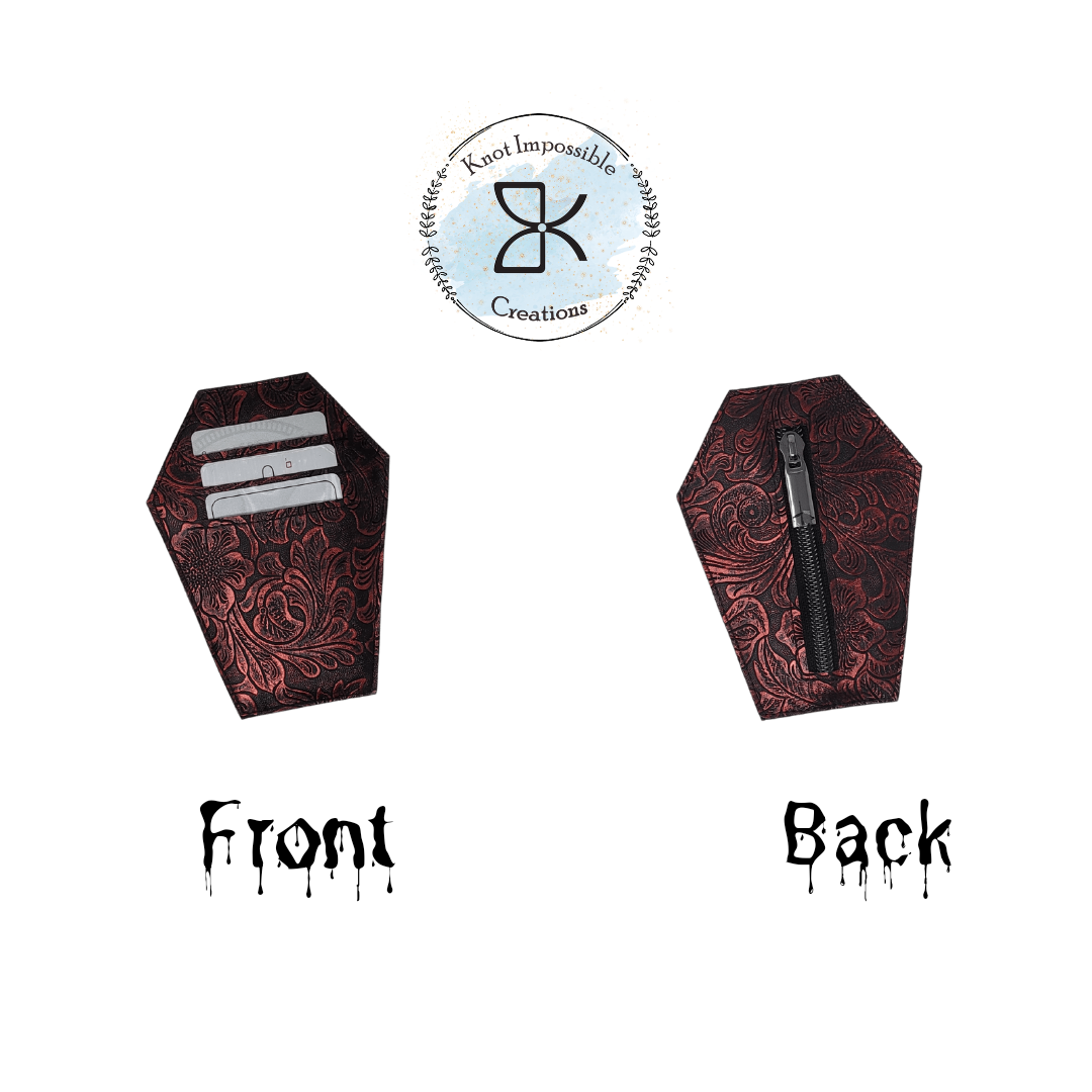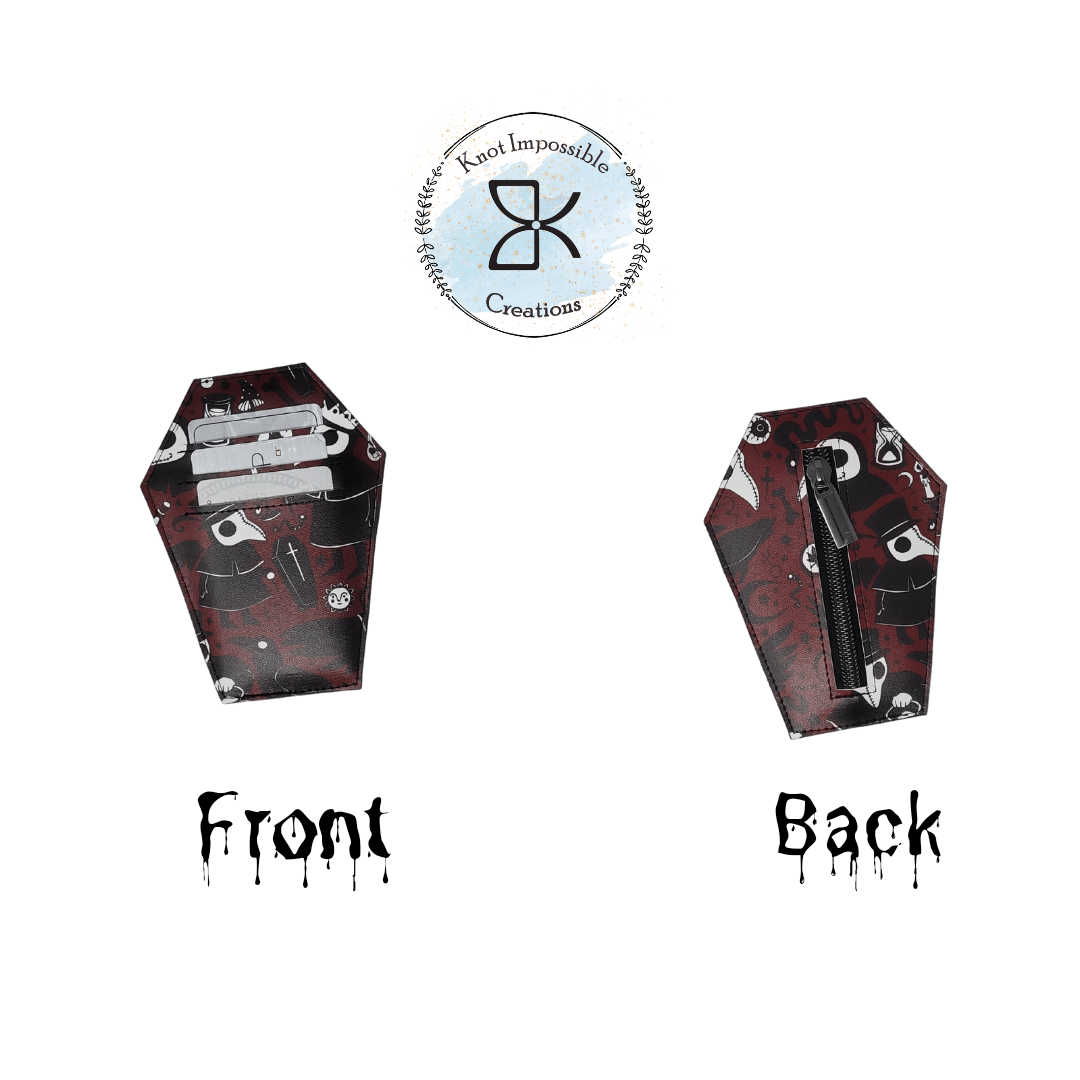 This gothic-inspired Mini Coffin Wallet is crafted from faux leather with 3 card slots and a small zipper pocket. Its unique design is sure to make an impression, while its functional layout makes it practical for everyday use. It's a chic and unexpected accessory that's sure to turn heads.